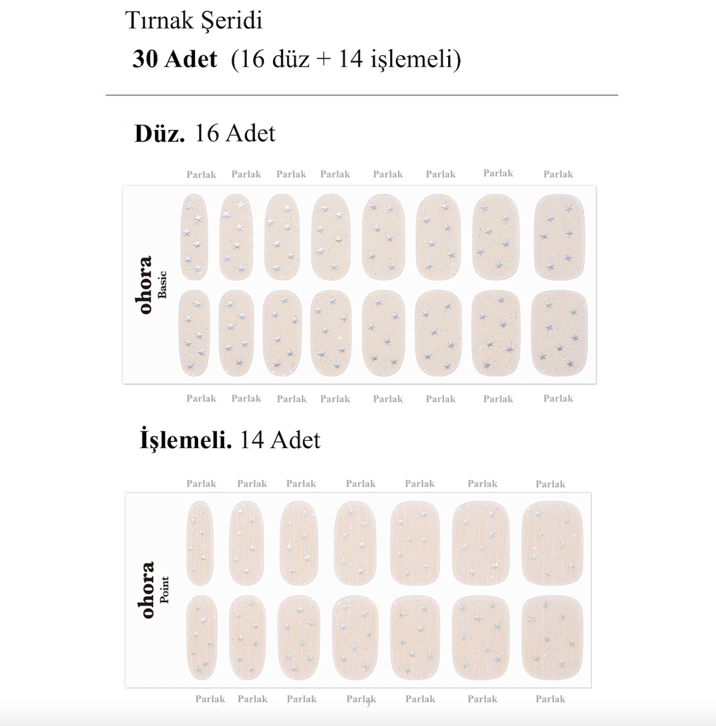 Her Ohora paketi, farklı tırnak boyutlarına uygun 30 adet jel şerit içerir. Bu sayede bir paketle iki kez kullanım mümkün!