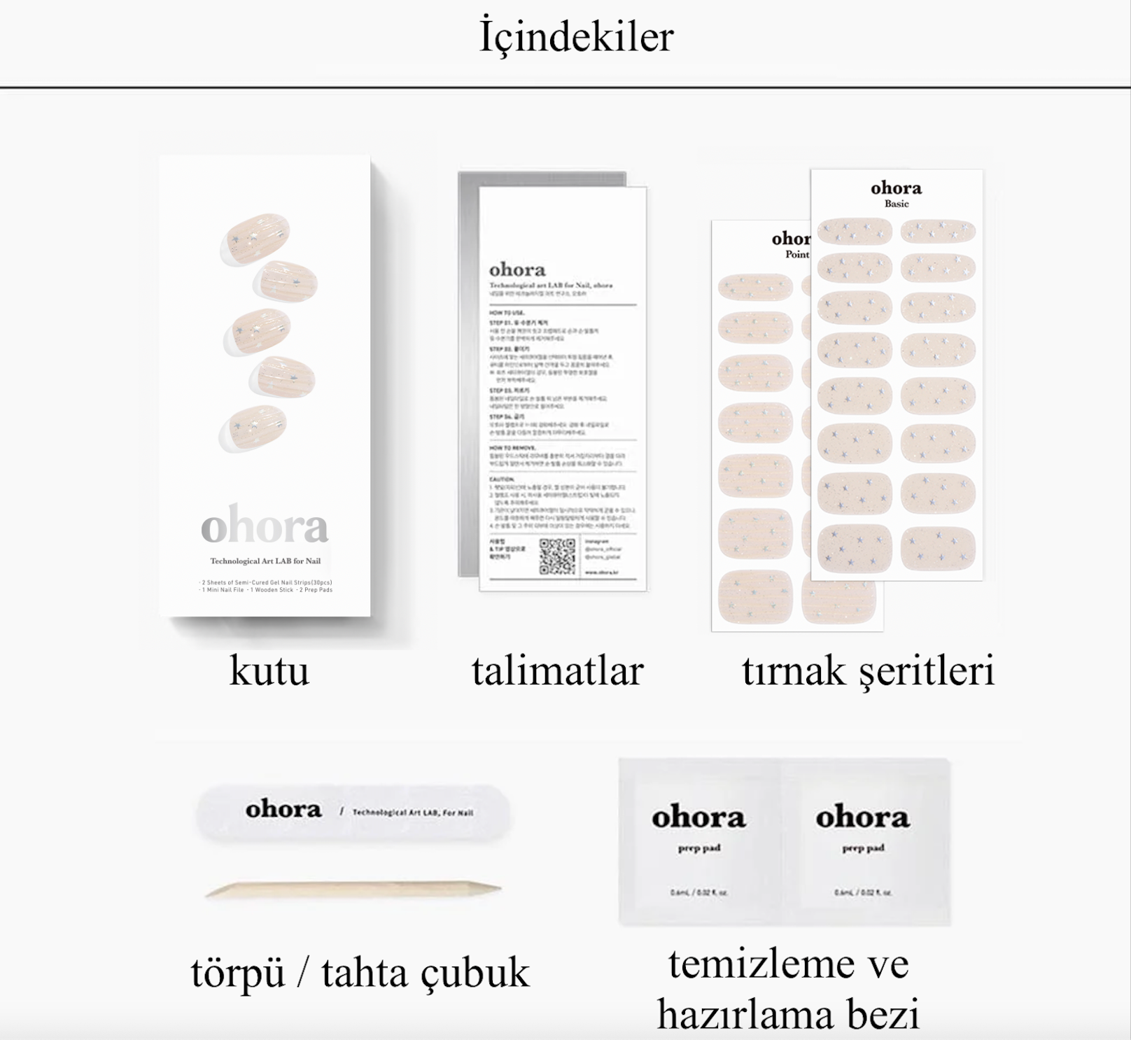 - 2 adet temizlik ve hazırlık bezi (uygulama öncesi tırnakları temizlemek için)