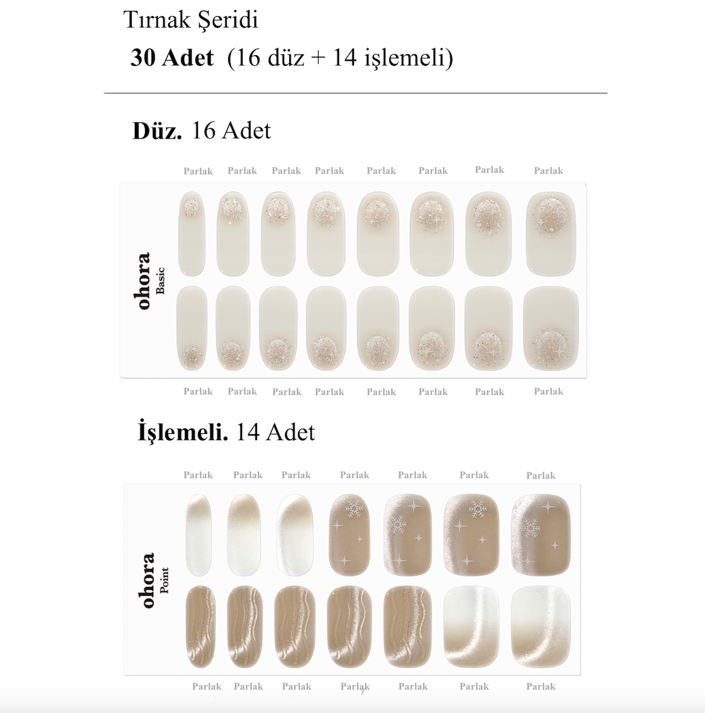 Her Ohora paketi, farklı tırnak boyutlarına uygun 30 adet jel şerit içerir. Bu sayede bir paketle iki kez kullanım mümkün!