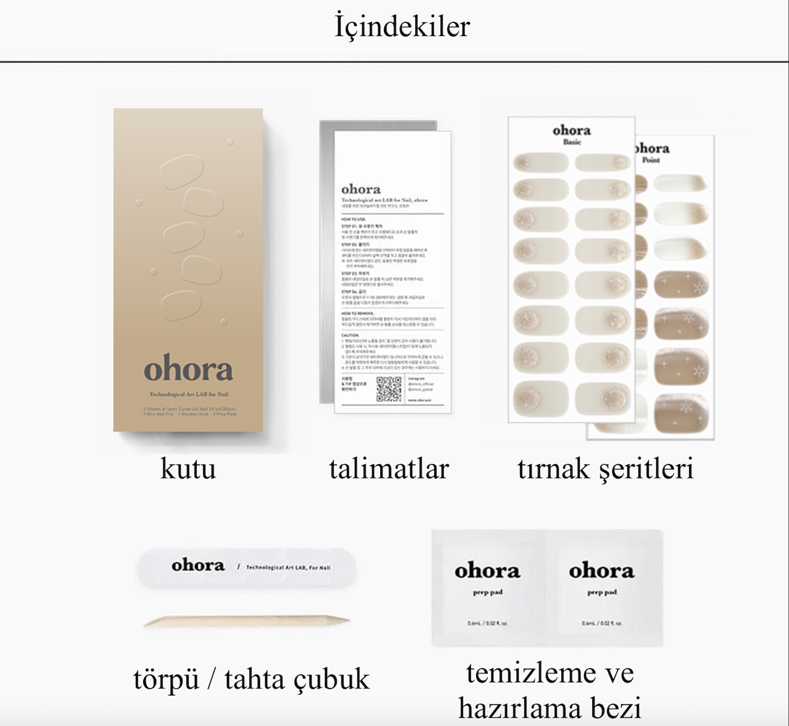 - 2 adet temizlik ve hazırlık bezi (uygulama öncesi tırnakları temizlemek için)