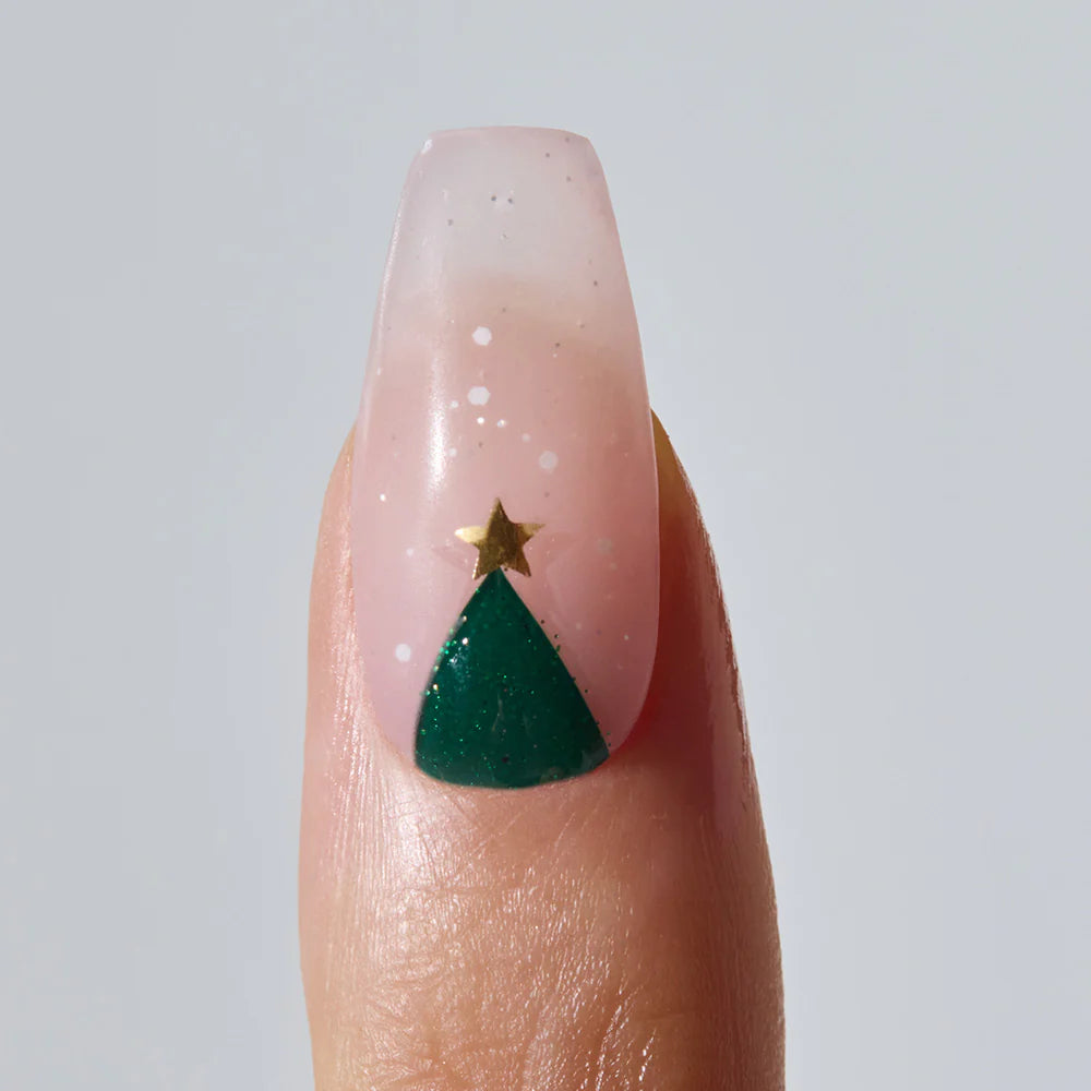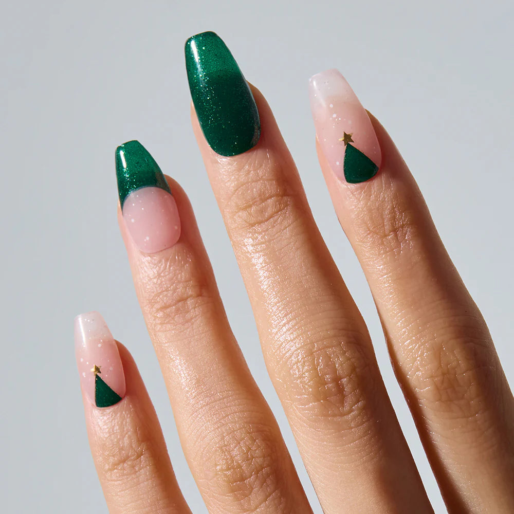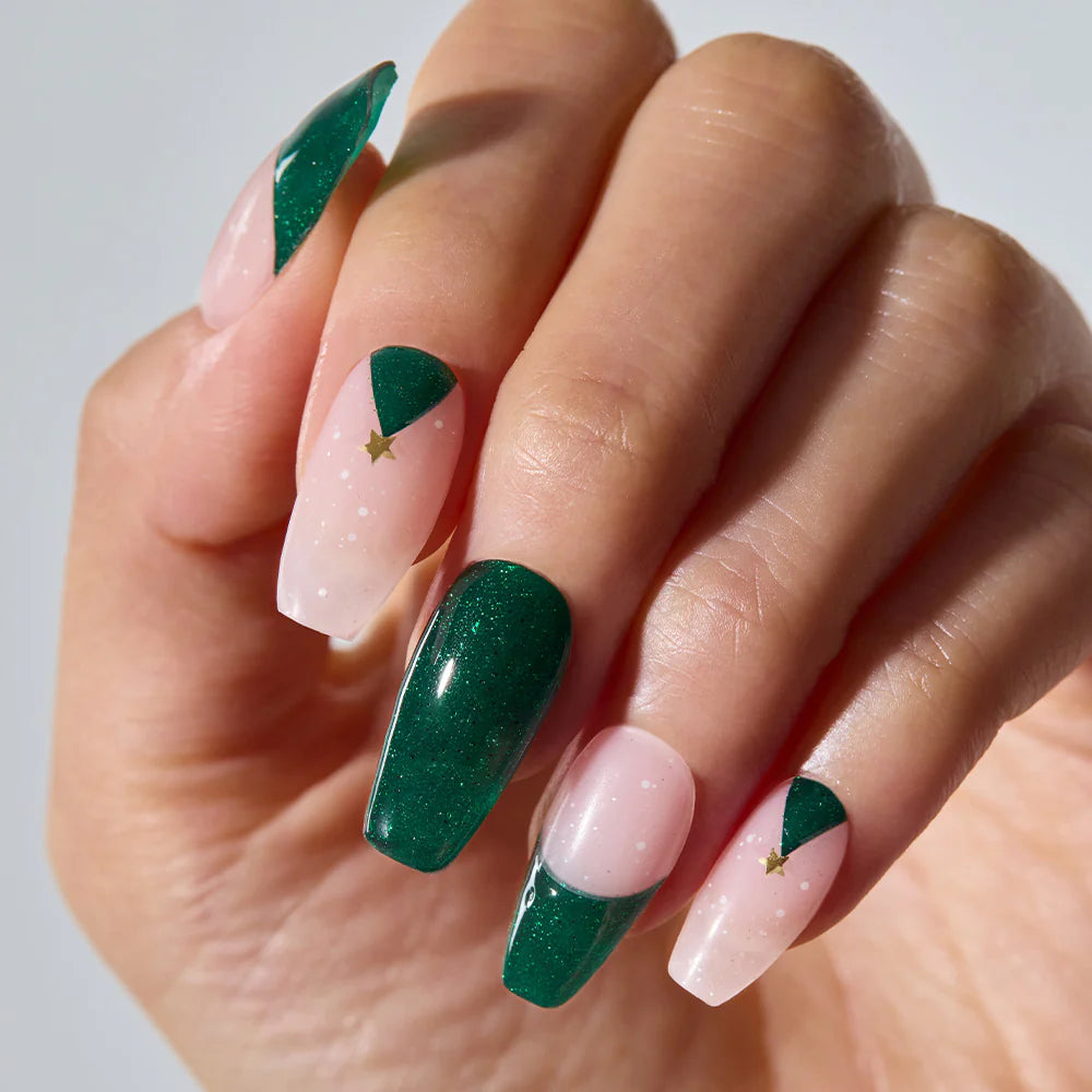 Zümrüt yeşili simli doku, zarif bir French tasarım ve altın yıldızlı minimal bir çam ağacı figürüyle tasarlanan tırnaklar festival ruhunu ellerinize getiriyor. Yılbaşı ruhunu ellerinize taşıyan bu jel tırnak seti, hem sade hem de dikkat çekici bir stil sunar.