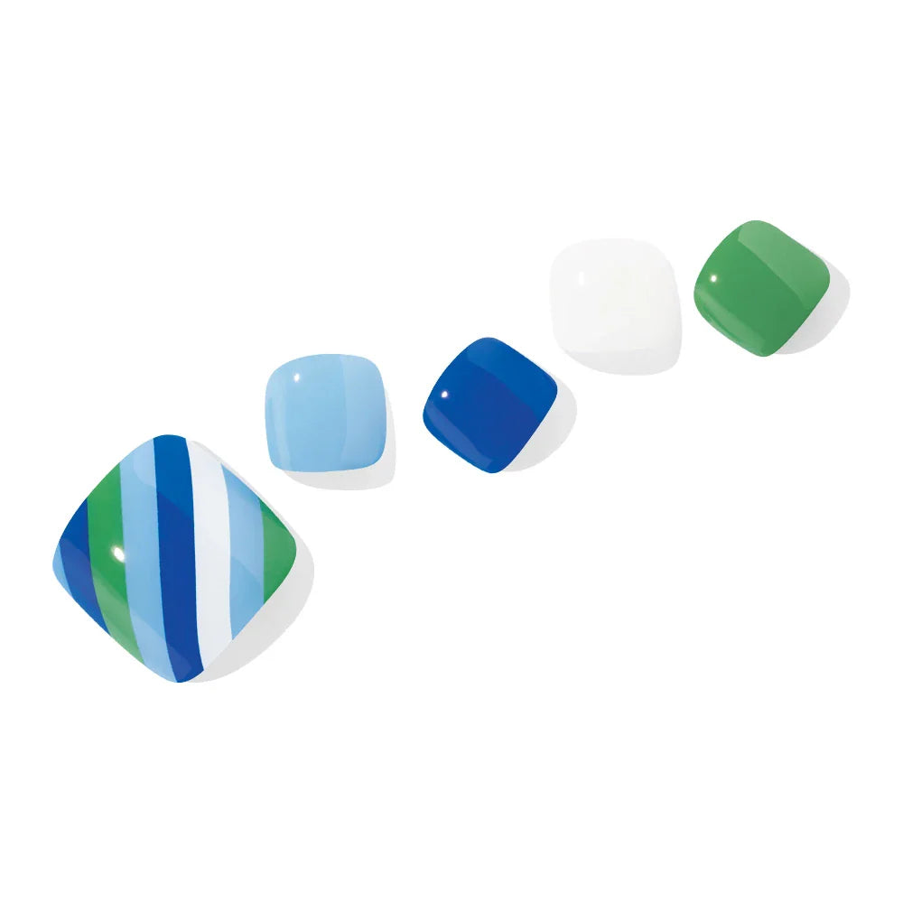 Serin denizine yansıyan parlak güneş ışığından ilham alınarak tasarlanmış bir yaz pedikürü. Canlı mavi, yeşil ve beyaz renklerini ve kalın çizgili bir desen içerir.