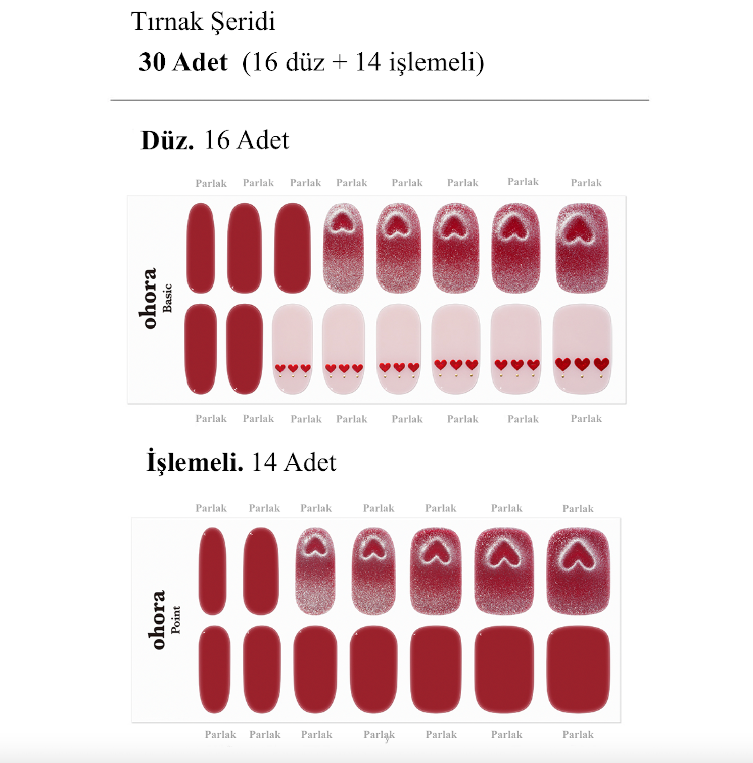 Her Ohora paketi, farklı tırnak boyutlarına uygun 30 adet jel şerit içerir. Bu sayede bir paketle iki kez kullanım mümkün!