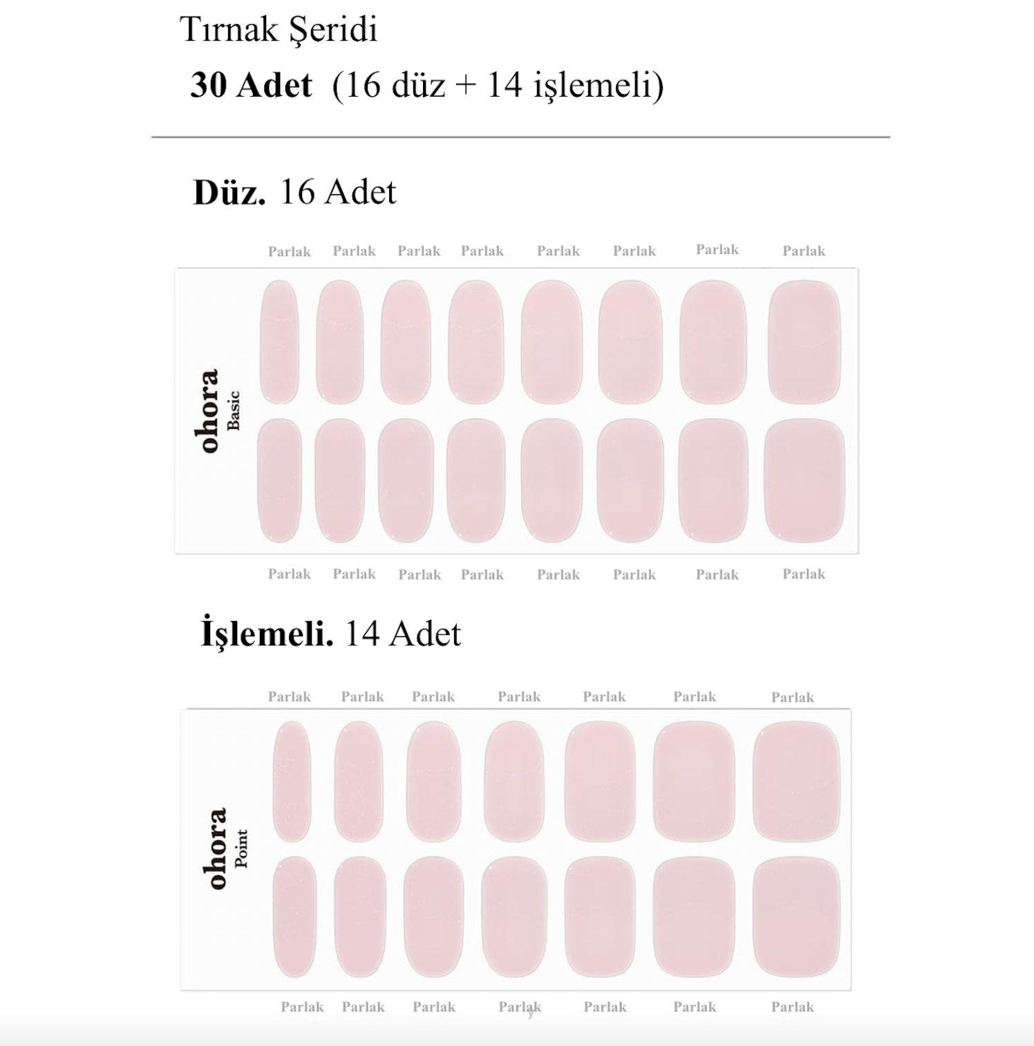 Her Ohora paketi, farklı tırnak boyutlarına uygun 30 adet jel şerit içerir. Bu sayede bir paketle iki kez kullanım mümkün!