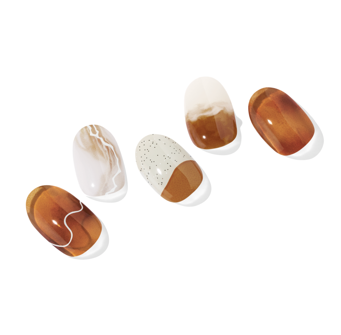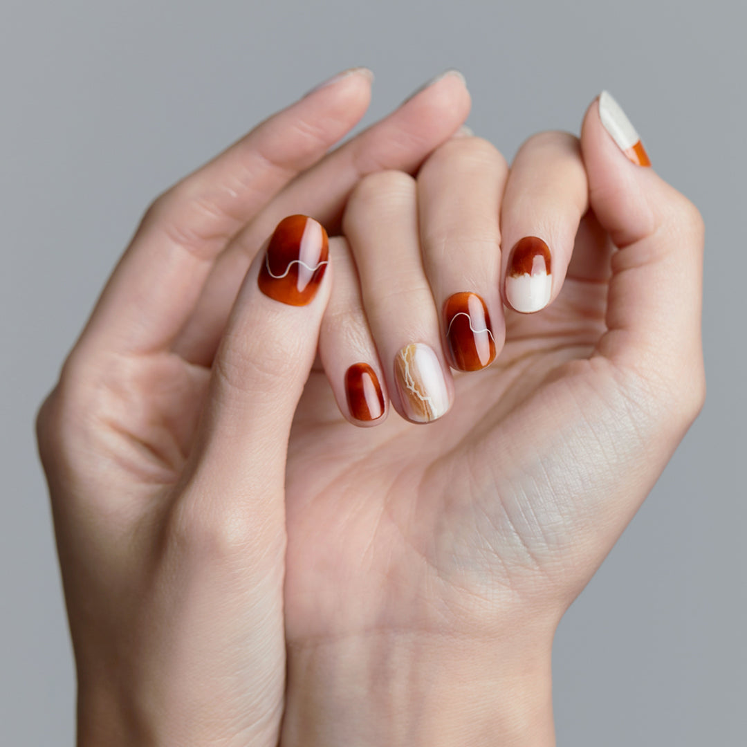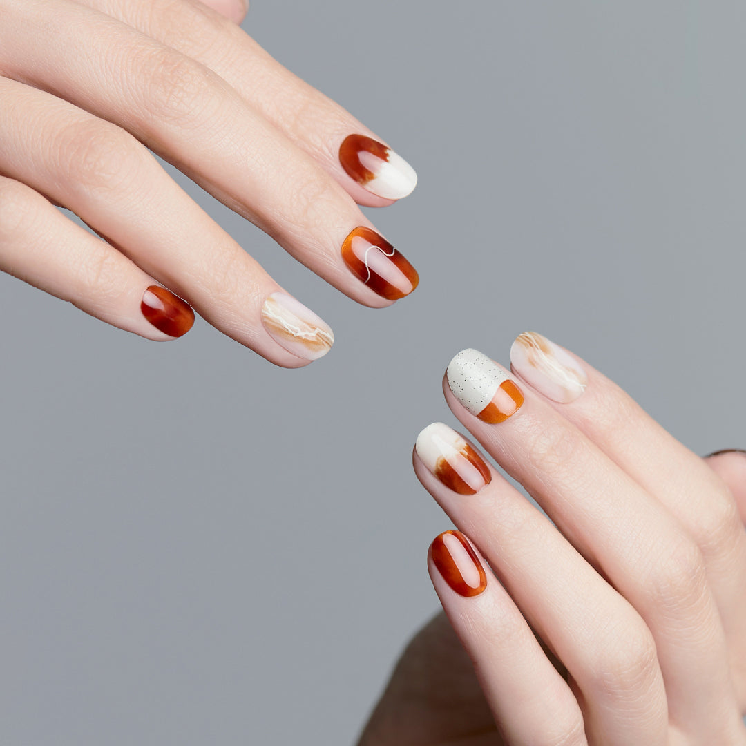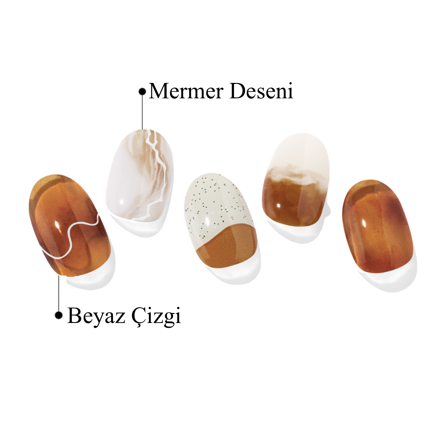 Karamel ve amber tonlarının sıcaklığını mermer desenleri ve minimalist beyaz çizgilerle bir araya getiren jel tırnak seti! Hem günlük kullanıma hem de profesyonel ortamlara uygun, dengeli bir estetik sunar.