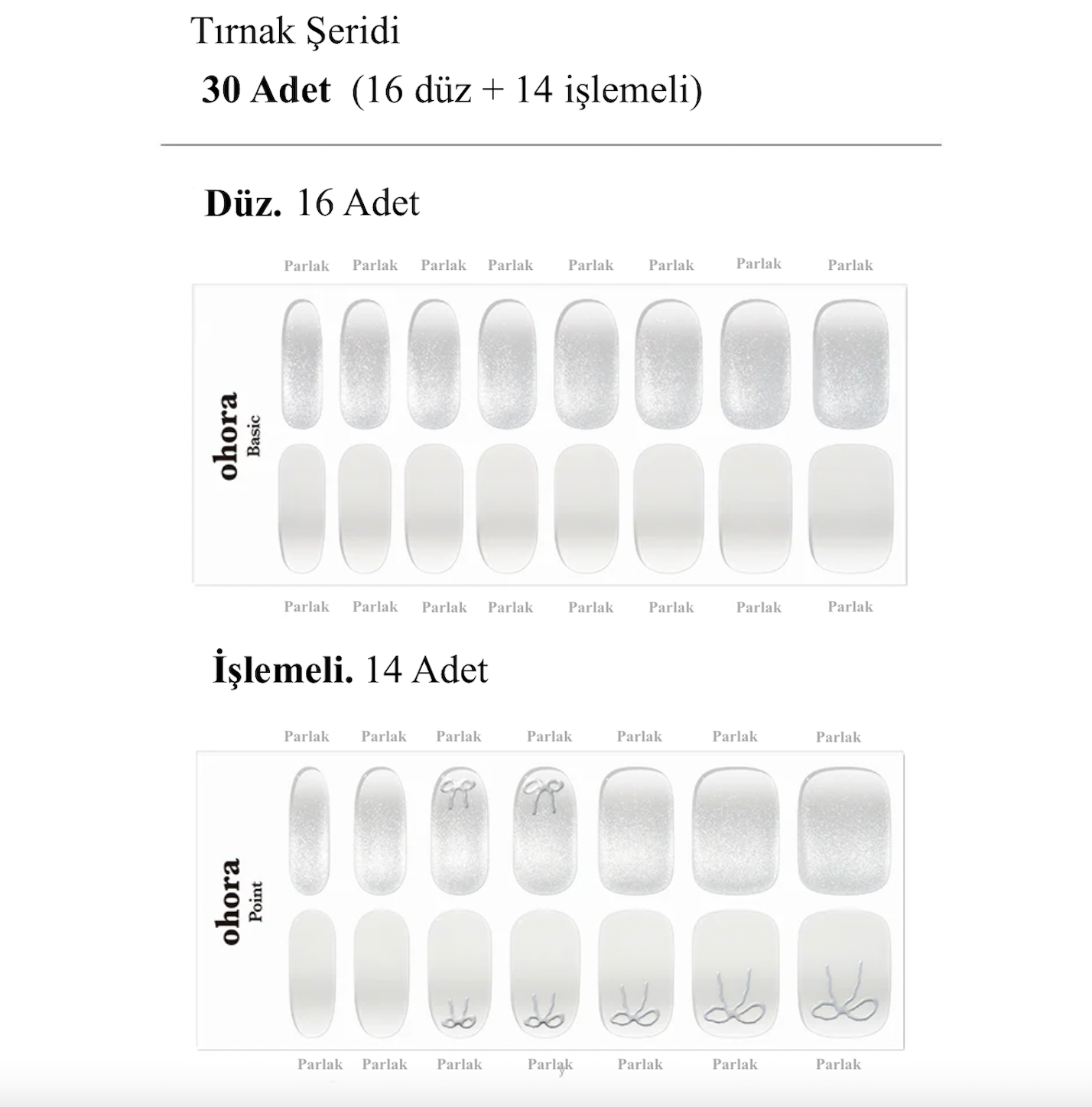 • 30 Adet Jel Tırnak Şeridi: Her tırnak yapısına uyum sağlaması için farklı boyutlarda hazırlanmıştır.