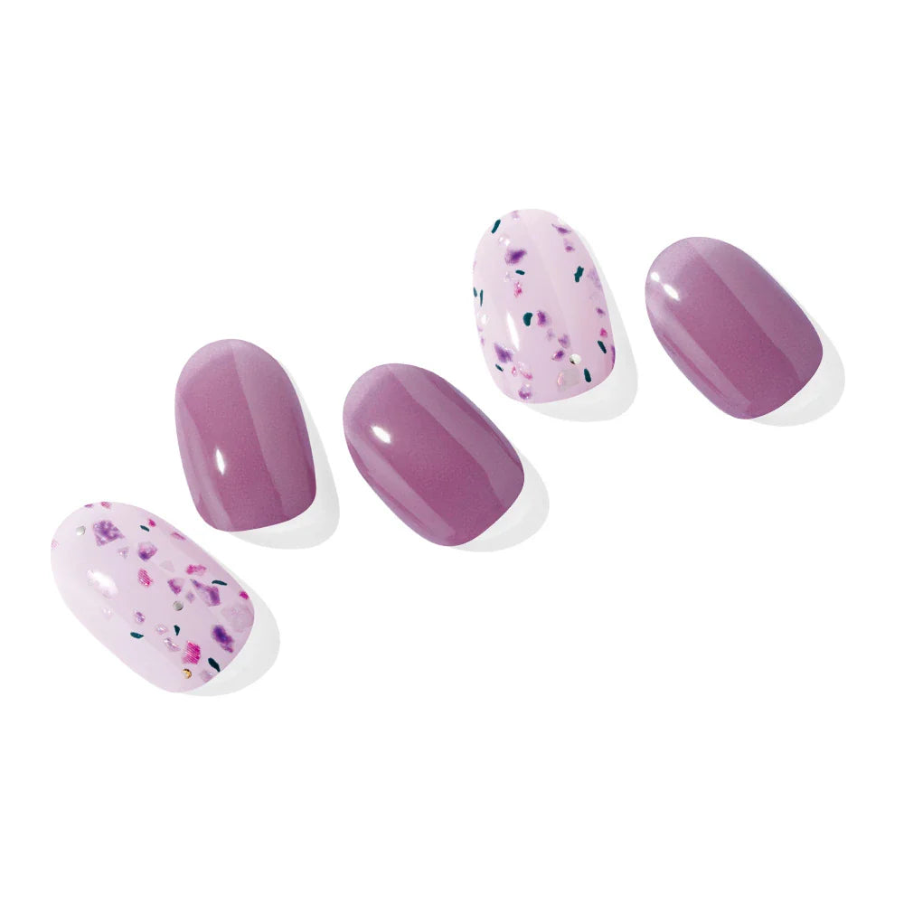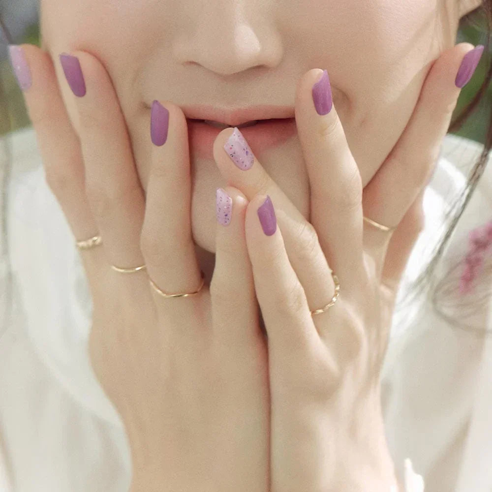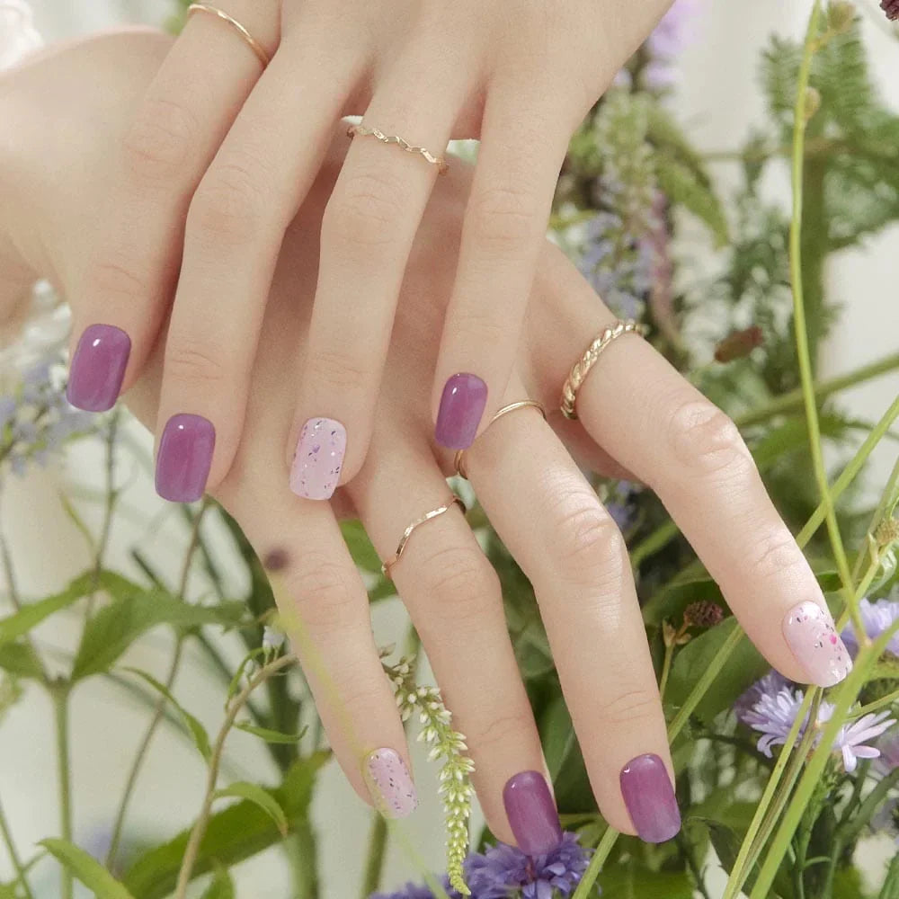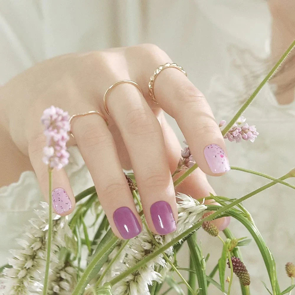 Lavanta çiçeklerini anımsatan güzel bir mor manikür. Mor ve lila renklerini lavanta yapraklarına benzeyen detaylı sedef parçalarıyla birleştirir.
