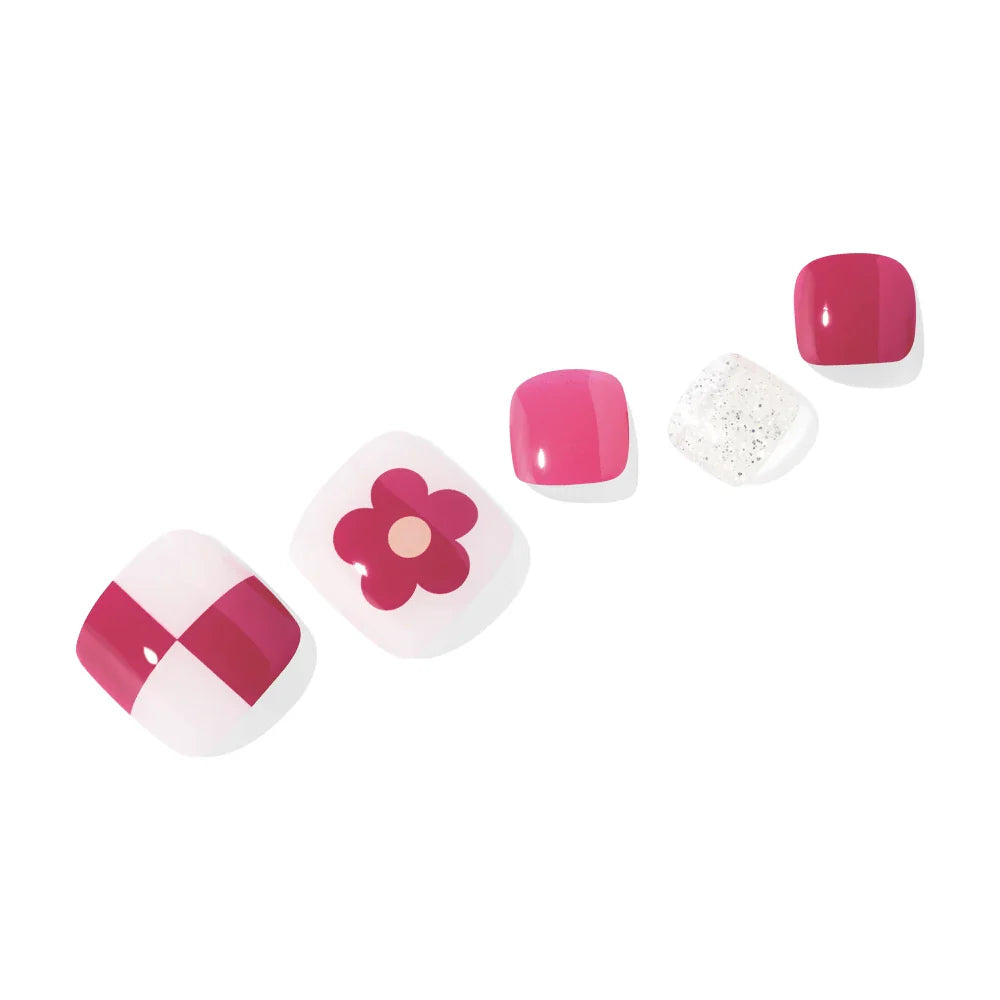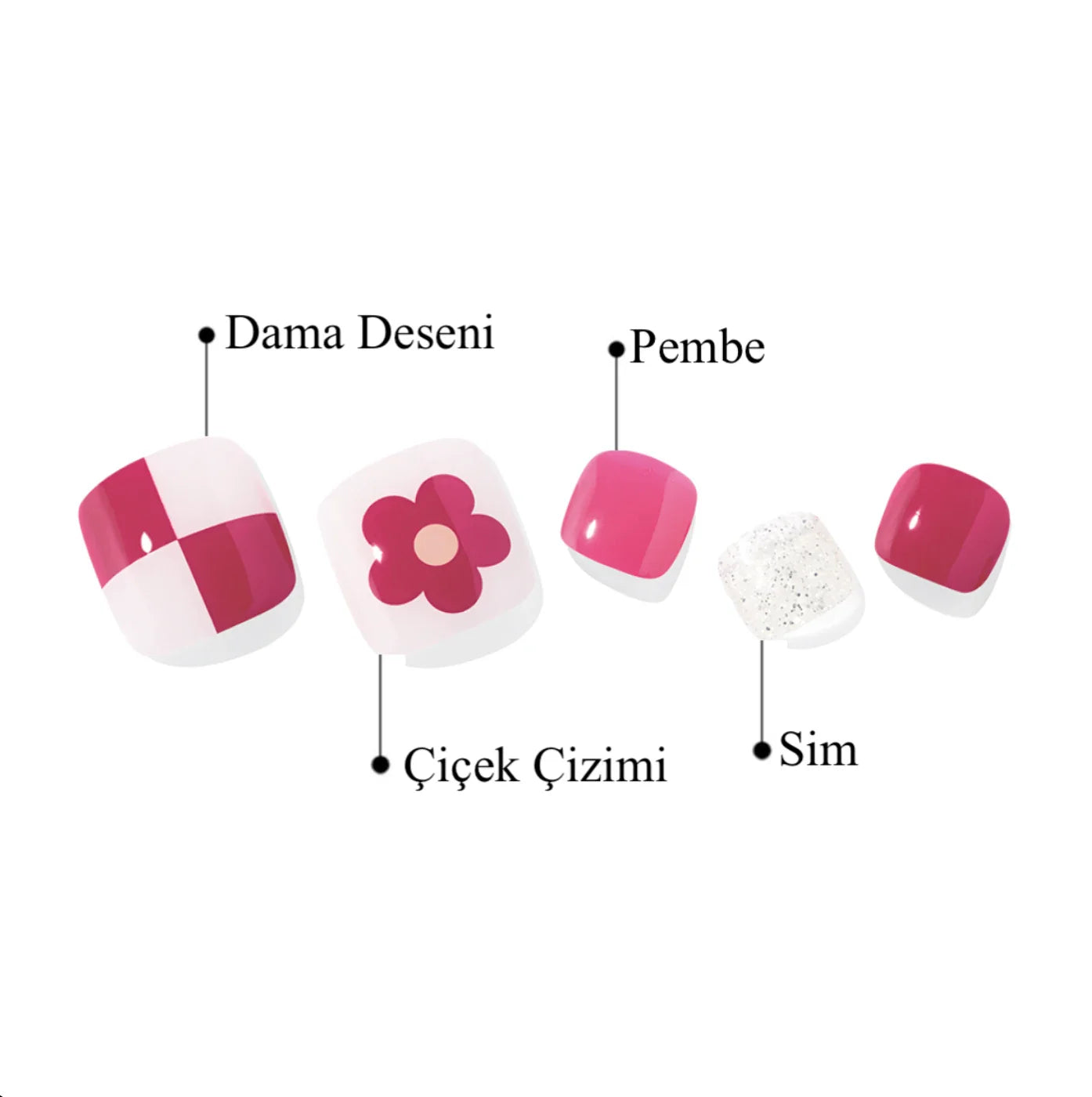 Bu sevimli yaz pedikürüyle ayaklarınıza renk katın! 2023 Pnatone yılın rengi olan "Viva Magenta" rengi kullanılarak yapılmış jel tırnak, modern dama deseni, papatya çizimleri ve ışıltılı simler içerir.