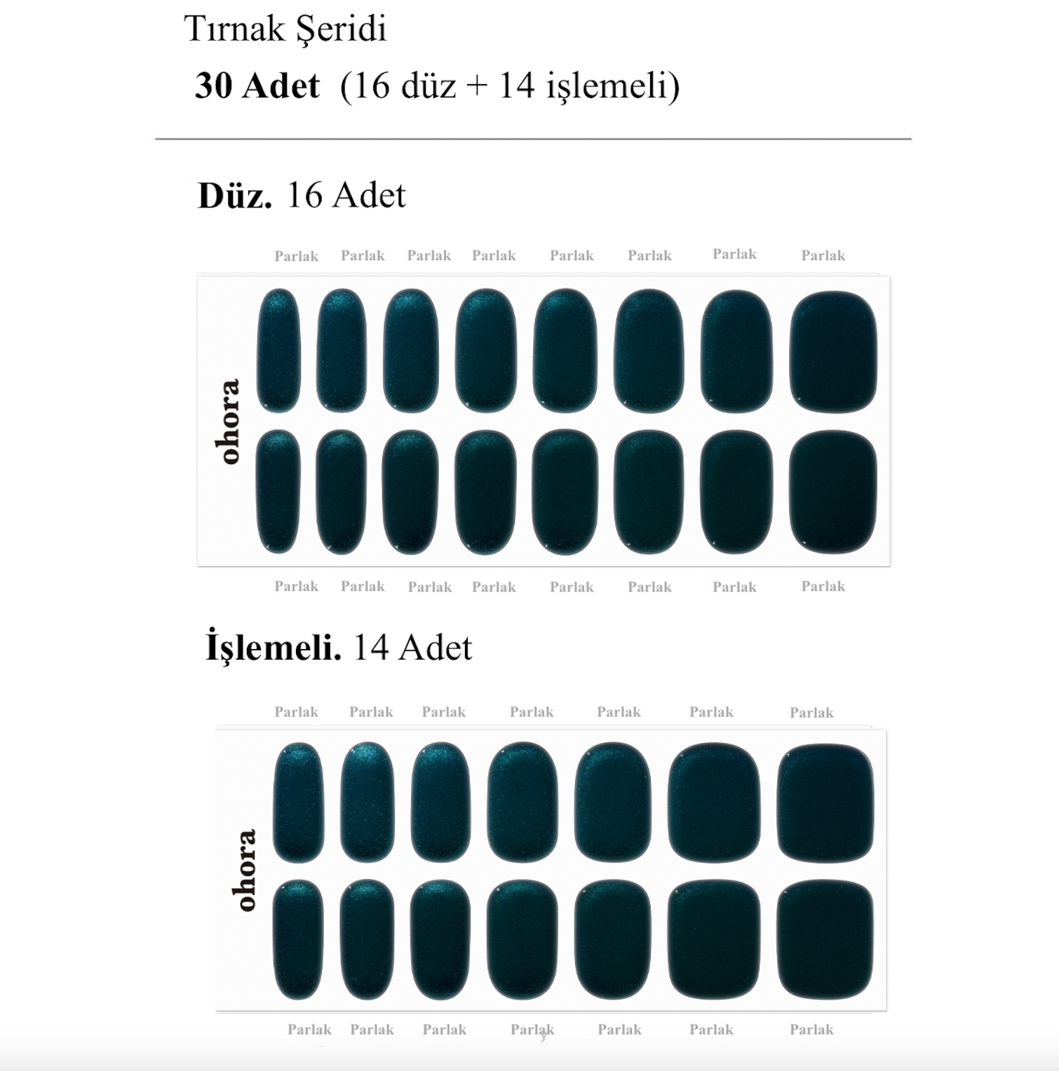 Her Ohora paketi, farklı tırnak boyutlarına uygun 30 adet jel şerit içerir. Bu sayede bir paketle iki kez kullanım mümkün!