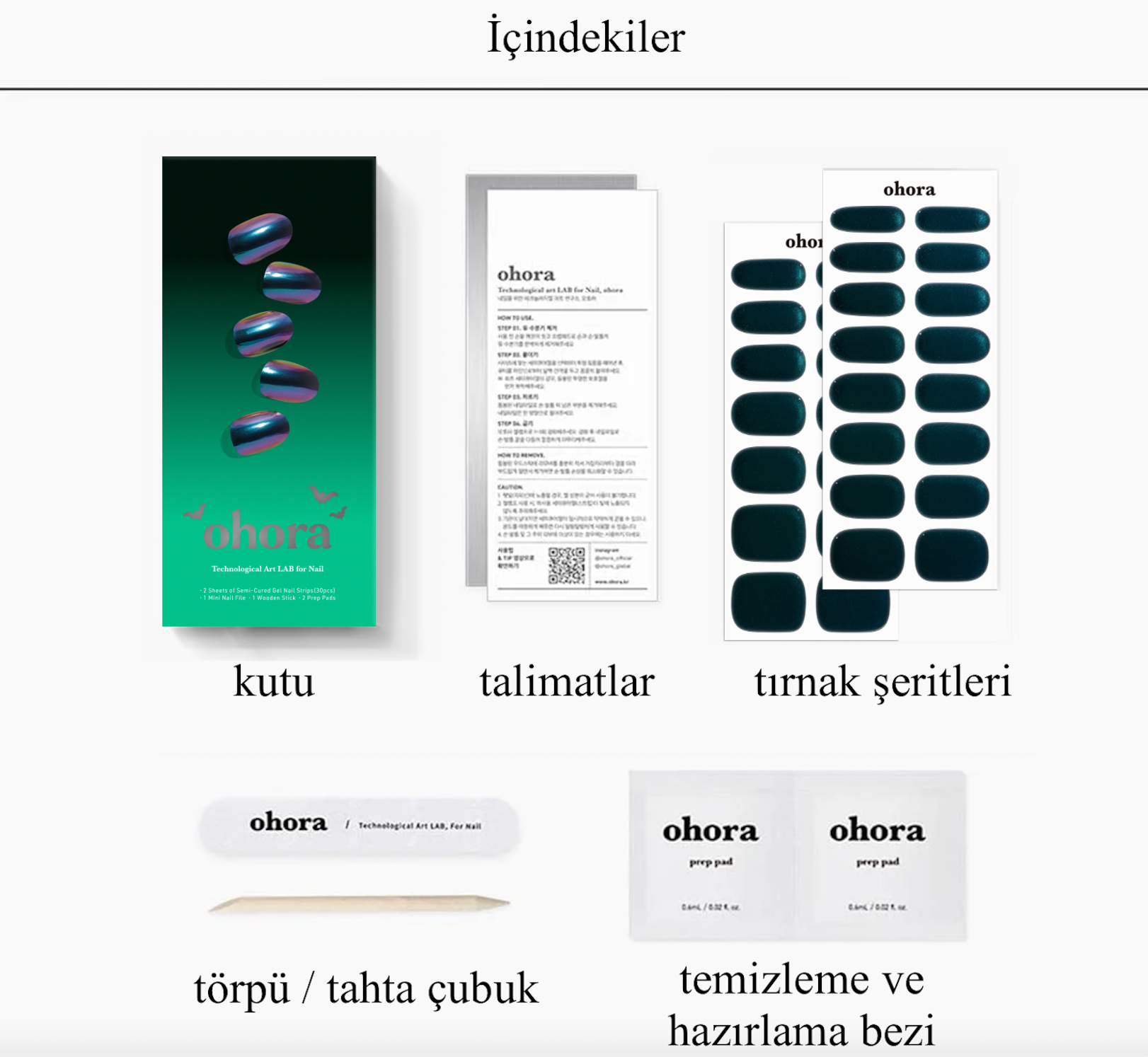 - 2 adet temizlik ve hazırlık bezi (uygulama öncesi tırnakları temizlemek için)